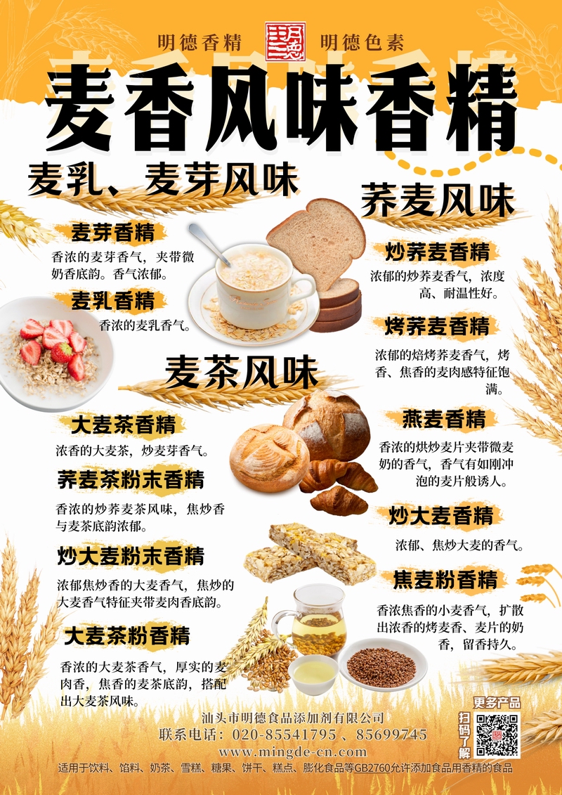明德麥香風味香精 谷物焙香 層次飽滿汕頭市明德食品添加劑有限公司推出的麥香風味香精系列,覆蓋麥乳、麥芽、蕎麥、大麥茶、燕麥、小麥粉等多種谷物調(diào)性。產(chǎn)品風味真實、層次清晰,留香穩(wěn)定,適用于飲料、雪糕、糖果、烘焙與休閑零食等B端應用,幫助工廠快速打造具有記憶點的麥香風味。