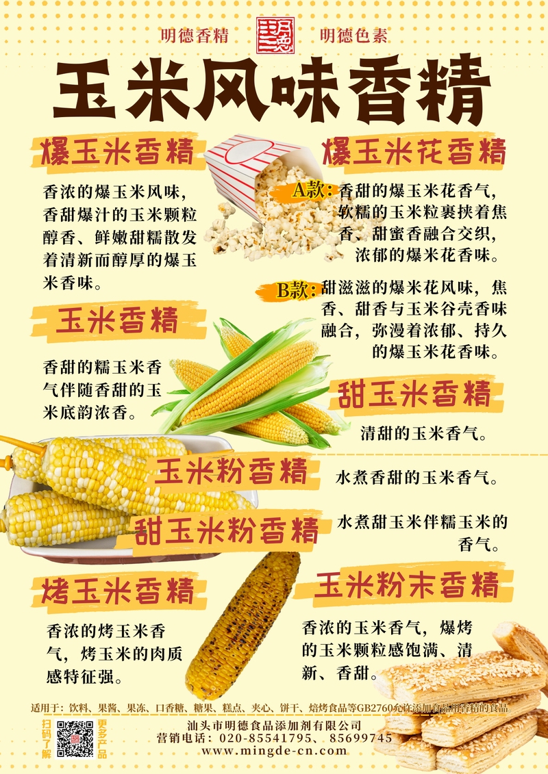 汕頭市明德食品添加劑有限公司推出的玉米風味香精系列,覆蓋爆玉米、爆玉米花、烤玉米、糯玉米、甜玉米及粉末型等多種調(diào)性。產(chǎn)品風味真實、留香穩(wěn)定,適用于飲品、烘焙、休閑零食、糖果及復(fù)合調(diào)味等B端應(yīng)用,幫助工廠快速打造具有記憶點的玉米風味。